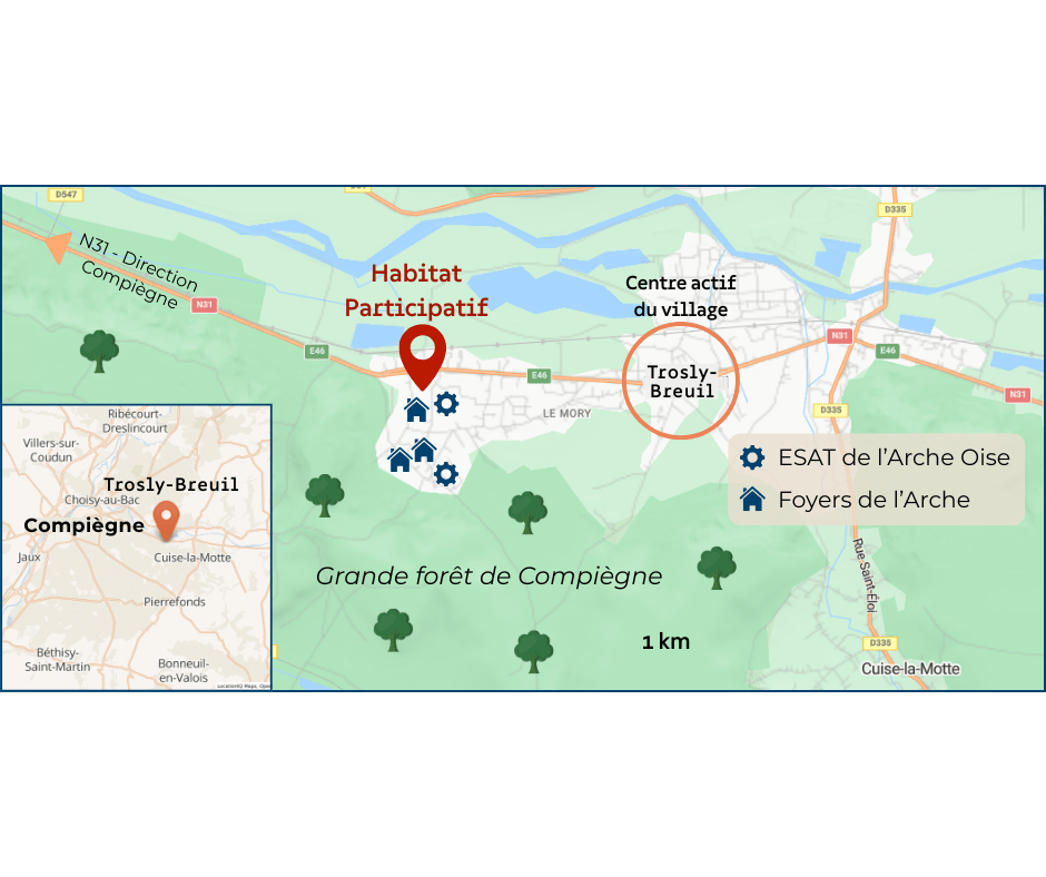 Situé à l’entrée du village de Trosly-Breuil (Oise), l’habitat participatif est à seulement 15 minutes de Compiègne (12 km) et entouré de forêt. Il est à proximité de la communauté de L’Arche à Trosly et de l’ESAT de L’Arche Oise, ainsi que du centre du village. C’est une ancienne ferme bien entretenue avec un beau parc, et la présence de nombreux espaces communs (cuisine, salles d’activités, buanderie…) facilite les interactions entre habitants.